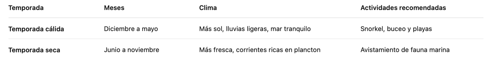 🐢 Tip: Entre abril y mayo el clima es ideal: mares calmados, excelente visibilidad para buceo y gran actividad de vida silvestre.